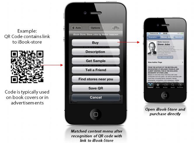 After recognizing a QR code, an intelligently integrated context-sensitive iPhone menu based on information provided by the scanned QR code is displayed depending on the code’s contents (e. g. link to iTunes, iBook store, App store, Safari URL).